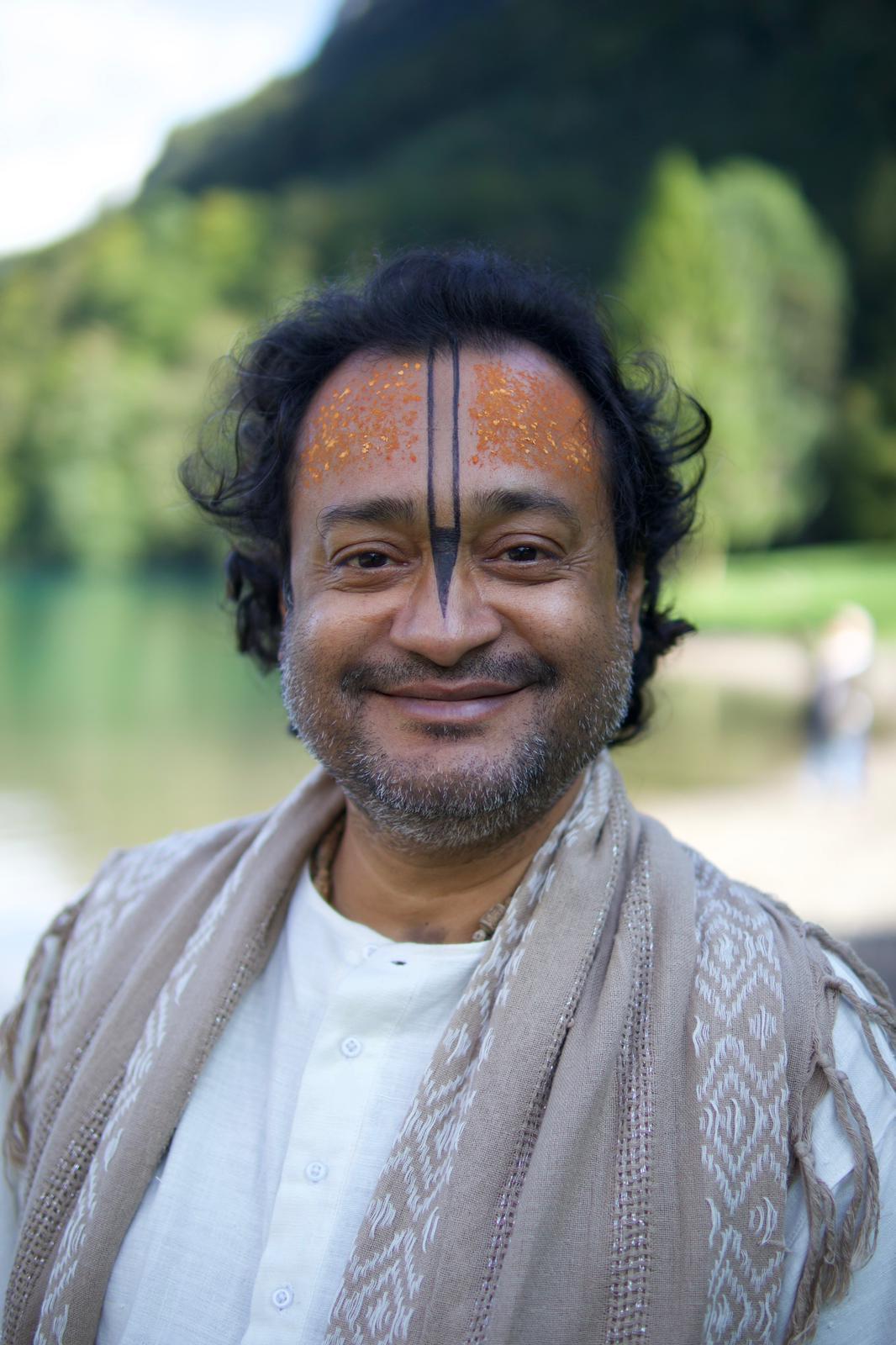 Prabhupād Śrīla Premgopāl Goswāmī appeared in Nabadwip, West Bengal, on the 4th of September 1972. He and his elder brother Prabhupād Śrīla Nityagopāl Goswāmī are the 14th descendent of Śrīman Nityānanda Prabhu family line (Nityānanda Vamsha). Our Prabhupād Śrīla Premgopāl Goswami's wife is Śrīmatī Upāsanā devī and they have one daughter Alankritā devī. His Dīkṣā-Guru is his grandmother Śrīmatī Gīta Mātā Gosvāmīnī, his Siddha Pranāli Guru is his father Prabhupād Śrīla Madangopāl Goswāmī and his Śikṣā-Guru is Śrīla Niśita Kumār Goswāmī. Prabhupād is an honorary title traditionally reserved for those born in the blood line of Śrīman Nityānanda Prabhu or Advaita Prabhu. Prabhupād Śrīla Premgopāl Goswāmī is a very dear servant of Śrī Nityānanda Prabhu, Śrī Gaurāṅga Mahāprabhu and Śrīmatī Rādhikā. Although his disciples and followers (out of faith and love) consider him a non-different manifestation Lord Nityānanda but he would never claim to be so. Descending into the family of Nitāi, along with his brother Prabhupād Śrīla Nityagopāl Goswāmī, he is carrying the message of pure bhakti and the transcendental mood of Śrī Śrī Nitāi Gaurānga far and wide into all corners of the earth. By spreading the moon rays of his deep knowledge and loving mood upon the conditioned souls of this material world he benefits everyone who meets him with the chance to enter the path of pure bhakti. He has the unprecedented potency to open the door to Śrī Vrindāvan Dhām and introduce us to the matchless gift of Mahāprabhu, Śrī Rādhā dāsyam, confidential service to Śrīmatī Rādhikā and Her beloved Kṛṣṇa in the mood of Rādhā’s maidservants (Pālya-Dāsi) , the mañjarīs. His joyous and auspicious Personality is infusing the transcendental bliss of the divine realm into the hearts of all who meet him. His consistent ever-readiness to share his knowledge, time and loving concern with everyone and to accept them into his elevated association is one of his virtues that spread the moon rays of Nitāichand’s mercy around the world.