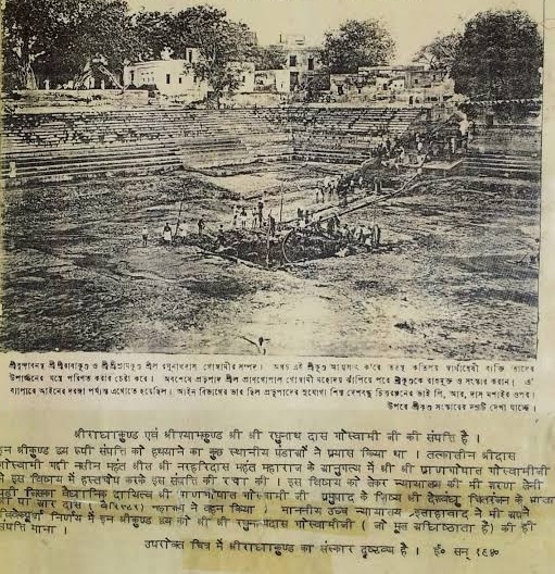 There are many more pastimes but I will only mention one more, the cleaning of Radha Kund. At that time it hasn’t been cleaned for hundreds of years and its condition was deplorable. Its water had become so muddy that it wasn’t even possible to take acaman, a few drops of caranamrita of the sacred liquid form of Srimati Radharani. Prabhu Prangopal was upset to see the kund in this condition and it brought tears to his eyes. Therefore he became determined to have it cleaned and renovated. This was a momentous task and involved a huge expenditure. But he was undeterred by the difficulties and started begging donations from door to door. He was helped by Sri Ramdas Babaji Maharaja and when some funds were raised the work started. At that point one local king claimed that Radha kund and the adjoining lands belonged to him. The case was brought to the High Court and Prabhu Prangopal’s disciple, the famous barrister PR Das, fought the case on behalf of the Gaudiya Vaiṣnavas and won it. The work was suspended for seven months and the money was spent. Prabhu Prangopal asked his wealthy disciple Priyanath Paul to undertake the financial responsibility for completing the work. Priyanath refused but that night Radharani appeared to him in his dream and reprimanded him for disobeying his Guru. The next day he apologised to his Guru and the work resumed. Radharani could not remain indifferent to the work undertaken by Her dear devotee, Her intimate maidservant, for Her own service.
